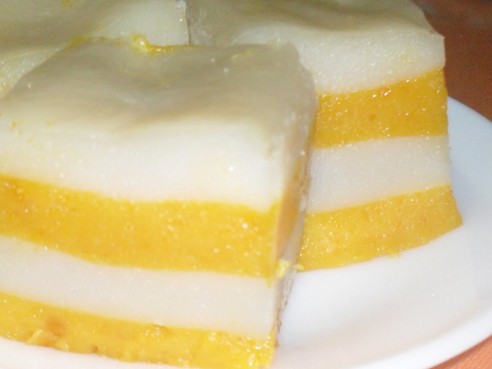 Tuang lapisan putih keatas lapisan labu tadi.Ulang proses sehingga selesai.